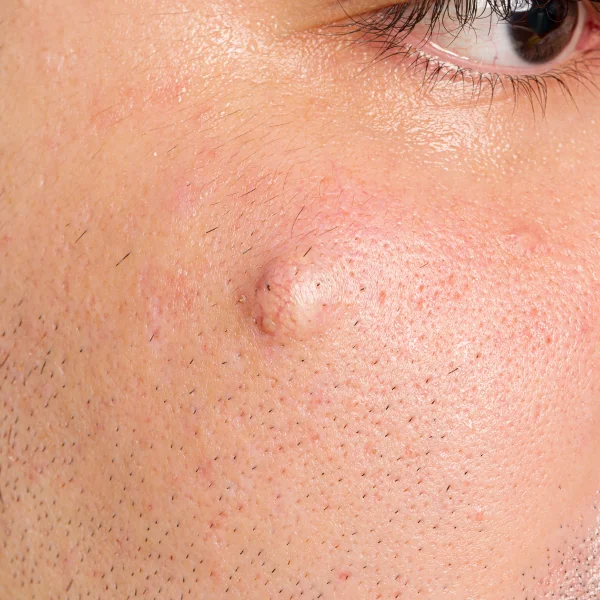 Le kyste sébacé est une accumulation de sébum sous la peau, formée à la suite d’une obstruction du canal de la glande sébacée. Il est :